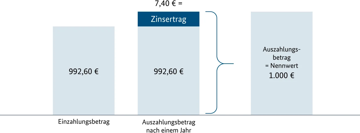 Schematische Darstellung der Renditeberechnung für Finanzierungsschätze: Der Ertrag ergibt sich als Differenz zwischen Rückzahlungsbetrag zu 100 % des Nennwerts und dem niedrigeren Kaufpreis